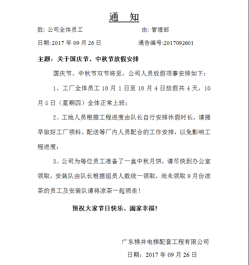 【 關于廣東梯井“國慶中秋”雙佳節放假時間安排的通知】